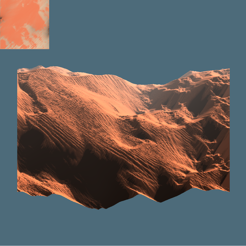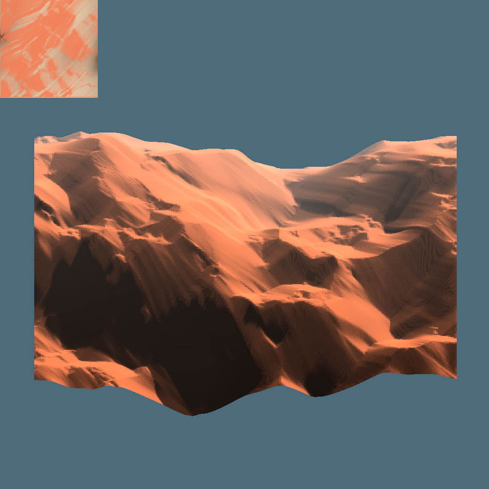 I layer the height and sediment maps into a single mesh, and draw the windpath map together with the sediment map on a small billboard in the corner of the window.